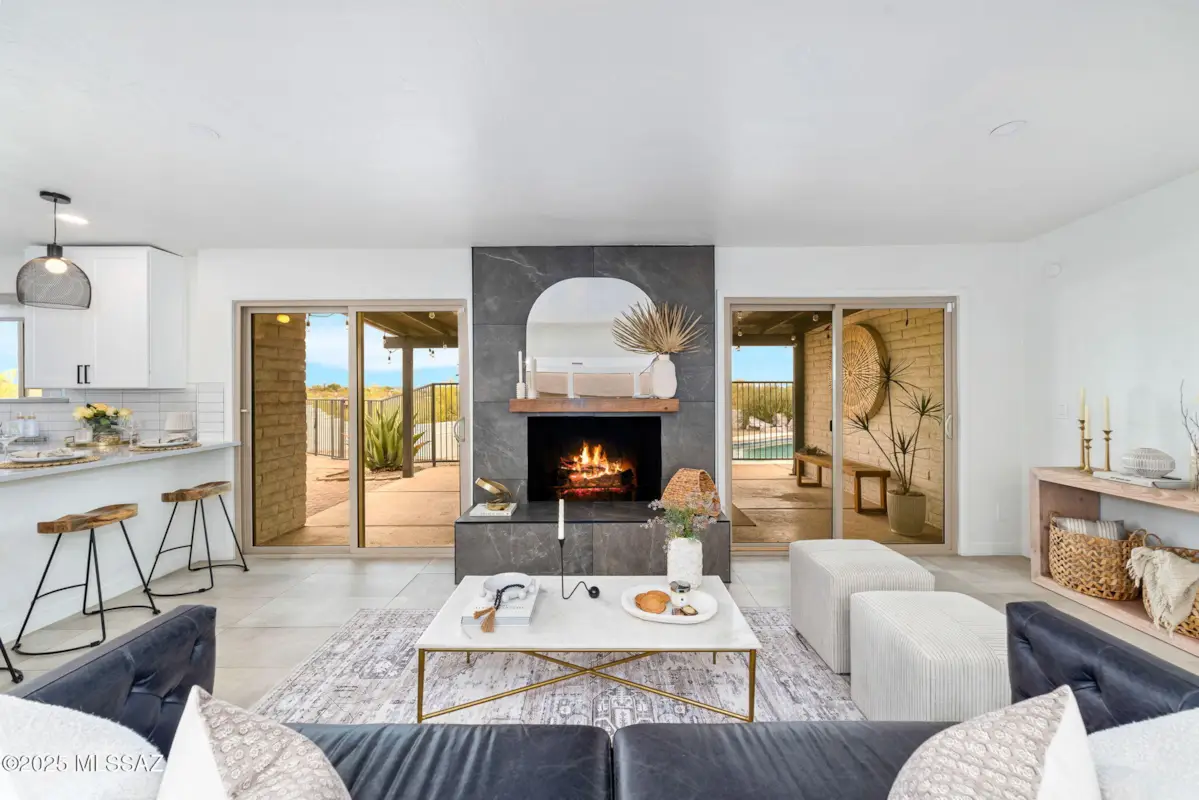 Tucked on a private and elevated lot with sweeping city and mountain views, this beautiful and completely remodeled 4bd/2ba hacienda-style home offers a seamless blend of charm and modern upgrades. Step inside into a peaceful sitting room with picture windows framing mountain views, and a central atrium that fills the home with natural light. With four spacious bedrooms, two beautifully updated bathrooms, a den, and a dining area featuring a custom wet bar, every space has been thoughtfully curated. The kitchen has stylish design choices, with a quartz countertop waterfall peninsula, high-end appliances, and pendant lighting. Outside, a generous sized covered patio, Pebble Tec pool and spa with a brand-new heater offers plenty of space for outdoor living.