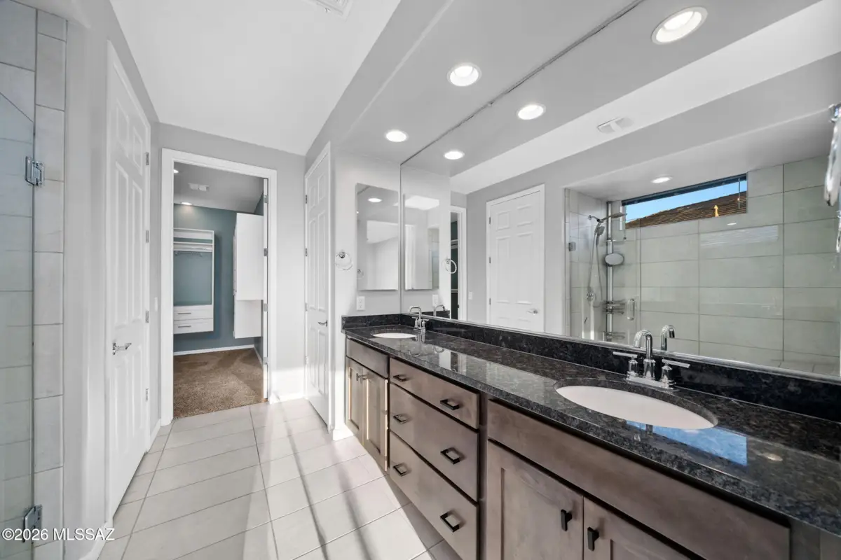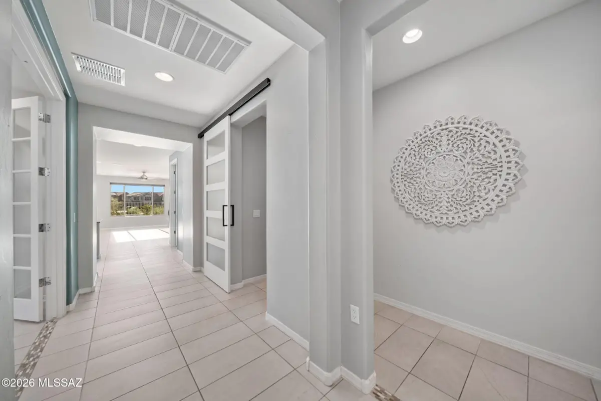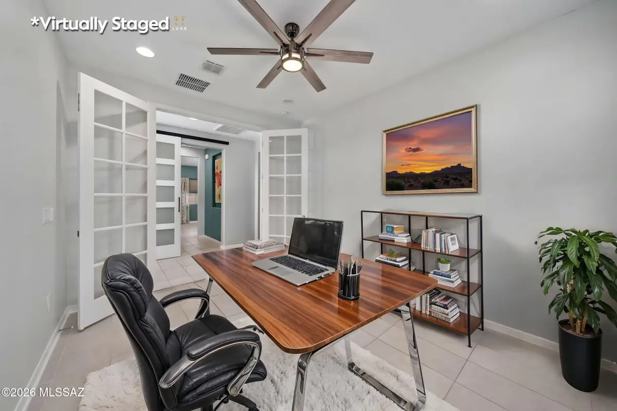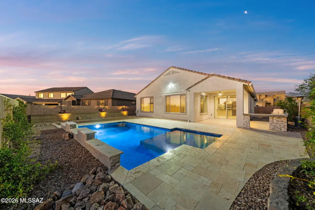 Resort style living at Rocking K with a heated pool and owned solar system awaits at this beautifully upgraded 4 bedrooms, 3 full baths home with a den. Step into a warm and inviting space with more than $100,000 in thoughtful upgrades, giving you a move in ready home without any of the construction hassle. The backyard is the true showpiece, featuring a heated pool with travertine decking, an outdoor kitchen, and lush landscaping, that creates a private retreat perfect for relaxing or entertaining year round. Inside, the home blends comfort and elegance with custom closets in three bedrooms, upgraded tile in key areas, motorized blinds in the living room, gourmet style kitchen with brand new GE counter-depth refrigerator, stylish barn doors, added ceiling fans in most rooms, and a professionally built additional bedroom with its own AC inverter for flexible living. Owned solar panels keep monthly TEP bills low, adding meaningful savings to everyday comfort. Additional upgrades include a widened driveway, paver walkways, water softener, laundry cabinets, direct wired exterior lighting, and a built in queen size Murphy bedframe that conveys. A truly special home offering a dream backyard, modern efficiency, and beautifully finished spaces throughout. Come enjoy everything Rocking K has to offer! Prime brand new Vail Schools!